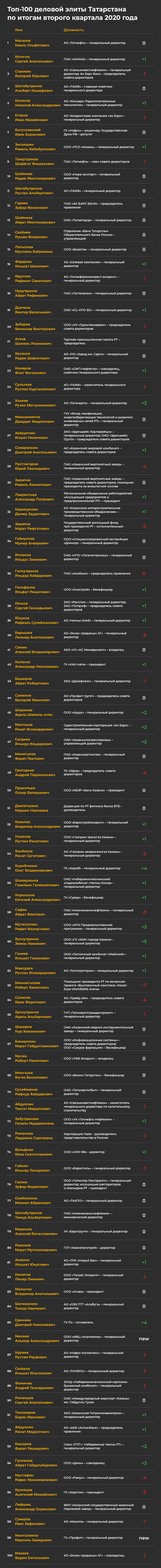 Особняком в топ-100 стоят фигуры, на которых особенно остро влияет текущая информационная и политическая повестка. Гендиректор ТНВ Ильшат Аминов (81) прибавил один пункт в рейтинге и может записать себе в актив резонансный сюжет ведущего «7 дней» Михаила Любимова из инфекционного отделения казанской больницы №7. Наполовину государственная телекомпания не побоялась разрушить благостную официальную картину, показав, как на самом деле обстоят дела с пандемией коронавируса в Татарстане. Неудивительно, что это был, пожалуй, самый резонансный материал ТНВ за все время существования телерадиокомпании. Кроме того, Аминов и его супруга продали москвичам Love Radio и Relax FM, что само по себе в период сильнейшего спада на рынке медийной рекламы является большим успехом.