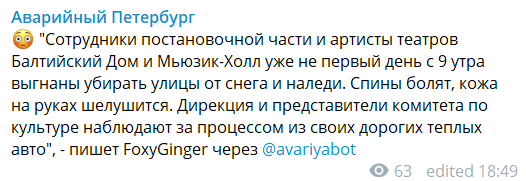 По данным, предоставленным Telegram-каналом «Аварийный Петербург» сегодня, девятого февраля в 18:49, сотрудники постановочной части и артисты театров Балтийский Дом и Мьюзик-Холл вынуждены убирать территорию у зданий. Их борьба начинается каждый день в девять часов утра. Люди жалуются на то, что из-за тяжелой работы у них болят спины и постоянно шелушится кожа.