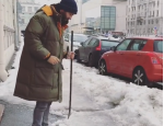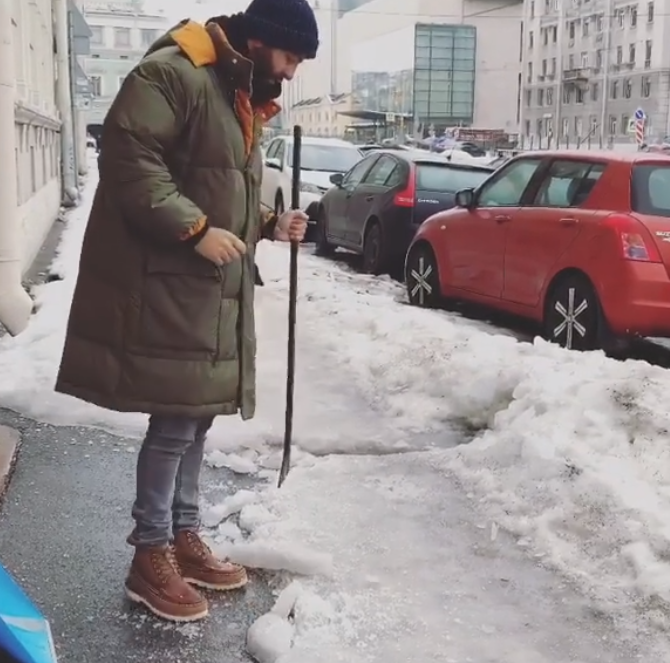 Телеведущий ломает лед ломом на улице Петербурга, тем самым пытается помочь бороться со снегом в северной столице. Ургант, пишет, что это обычный питерский вечер, но встретив свою бабушку, которая пробирается сквозь сугробы и пытается увернуться от глыбы льда с крыши, он решает помочь
