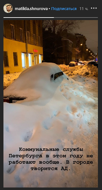 Фото засыпанной снегом машины на одной из улиц города, Матильда опубликовала у себя в Instagram.