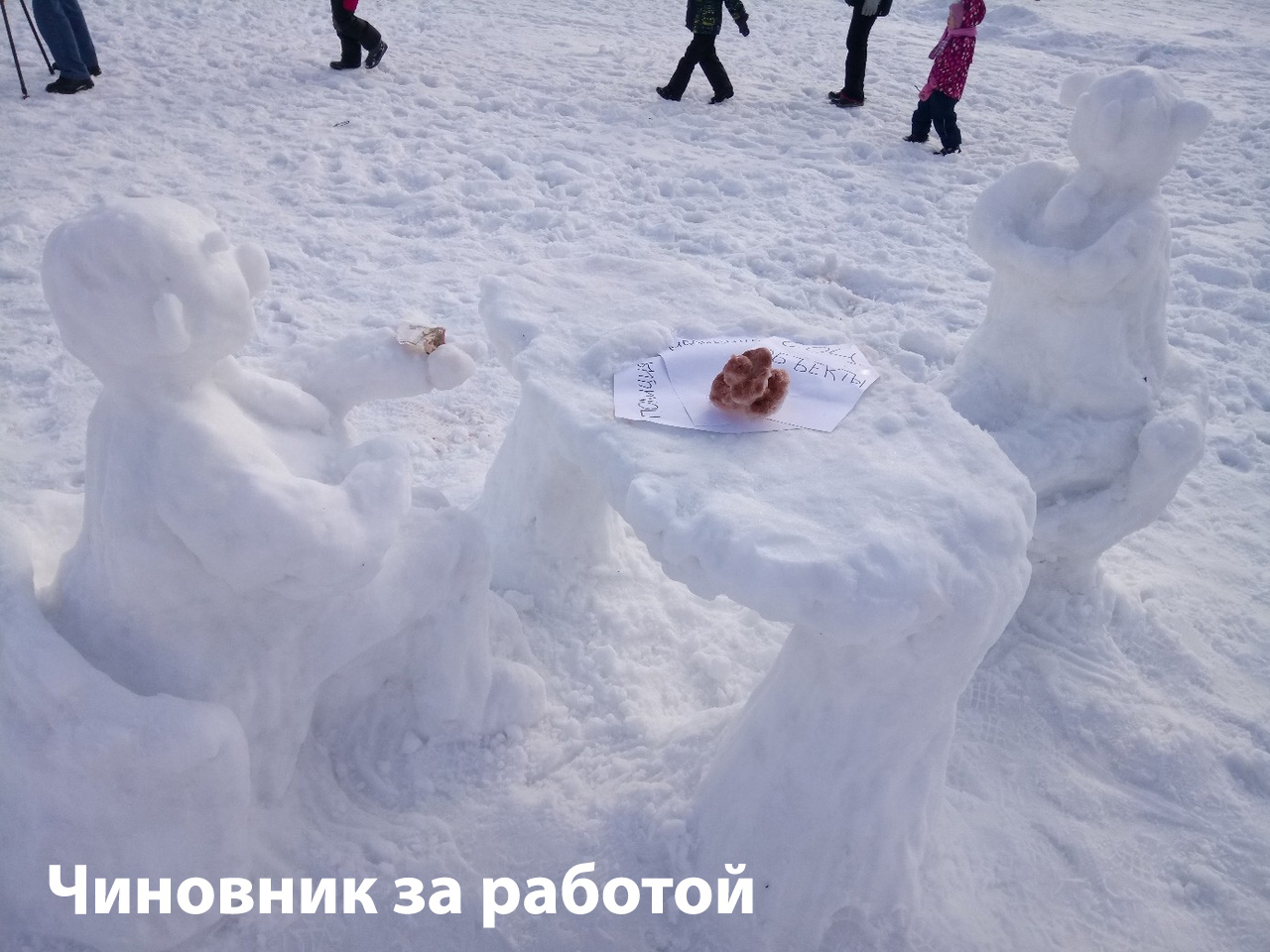 Стоит отметить, что жители к произведениям подходили с креативом и душой. Так, снеговик «Чиновник за работой» изображает сидящих за столом народных избранников. На повестке дня — строительство различных социальных объектов.