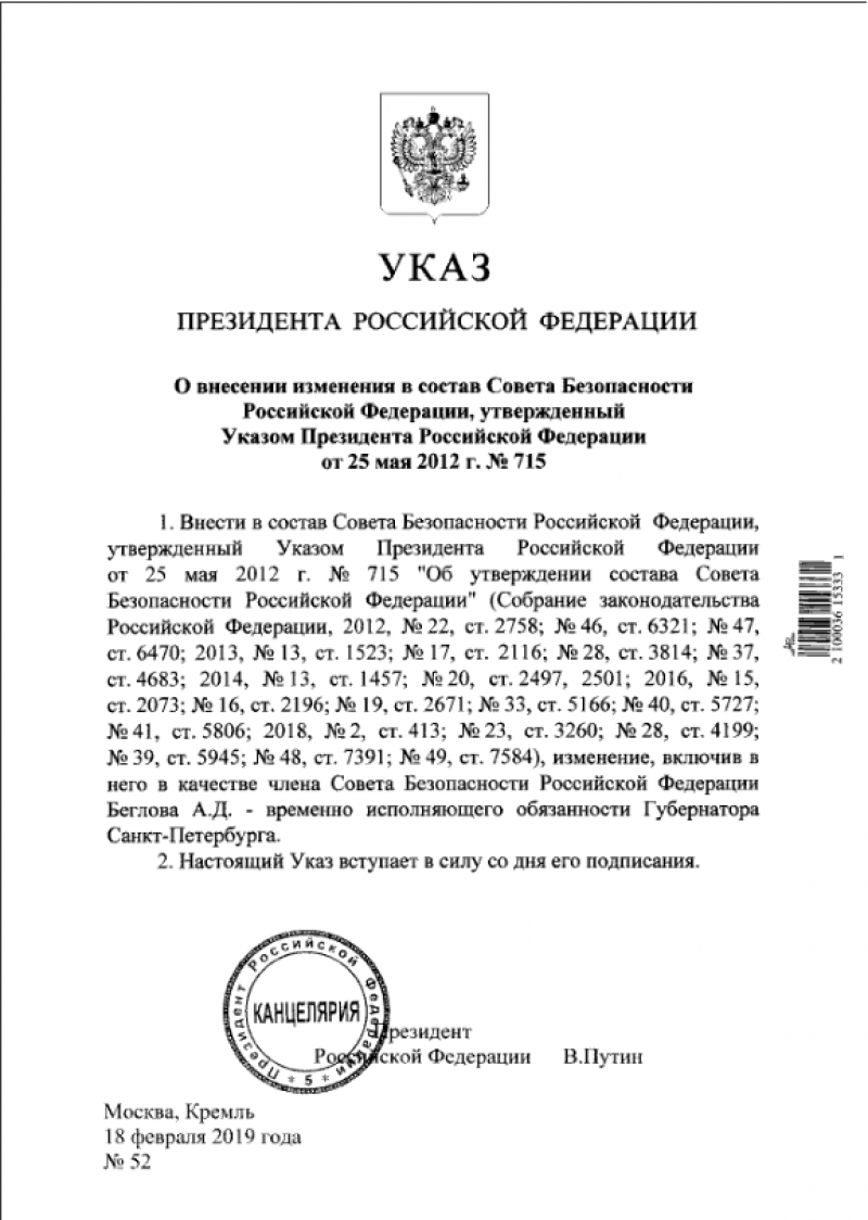 Президент России Владимир Путин подписал указ о включении временно исполняющего обязанности губернатора Санкт-Петербурга Александра Беглова в Совет безопасности России.