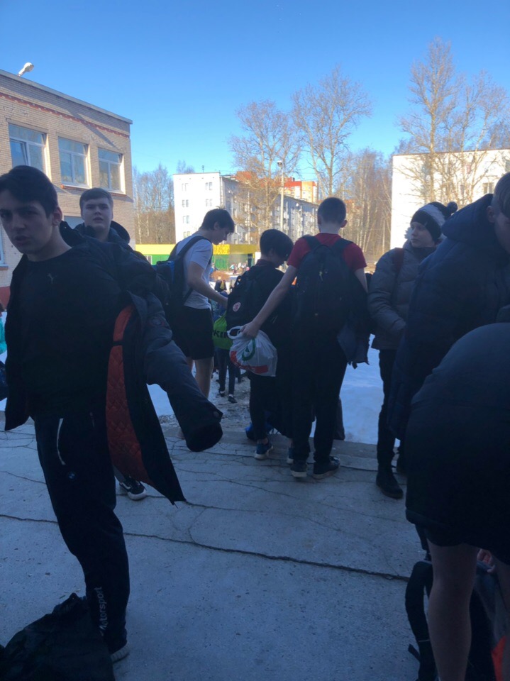 Ученики вынуждены покидать здание без верхней одежды. Вероятнее всего, у них проходил урок физической культуры, так как ребята в спортивной форме, некоторые в шортах и футболке.