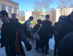 Ученики вынуждены покидать здание без верхней одежды. Вероятнее всего, у них проходил урок физической культуры, так как ребята в спортивной форме, некоторые в шортах и футболке.