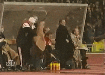 Победный гол Титова. Пока скамейка сходила с ума, Олег Иванович поправил плащ, застрявший под ногой.