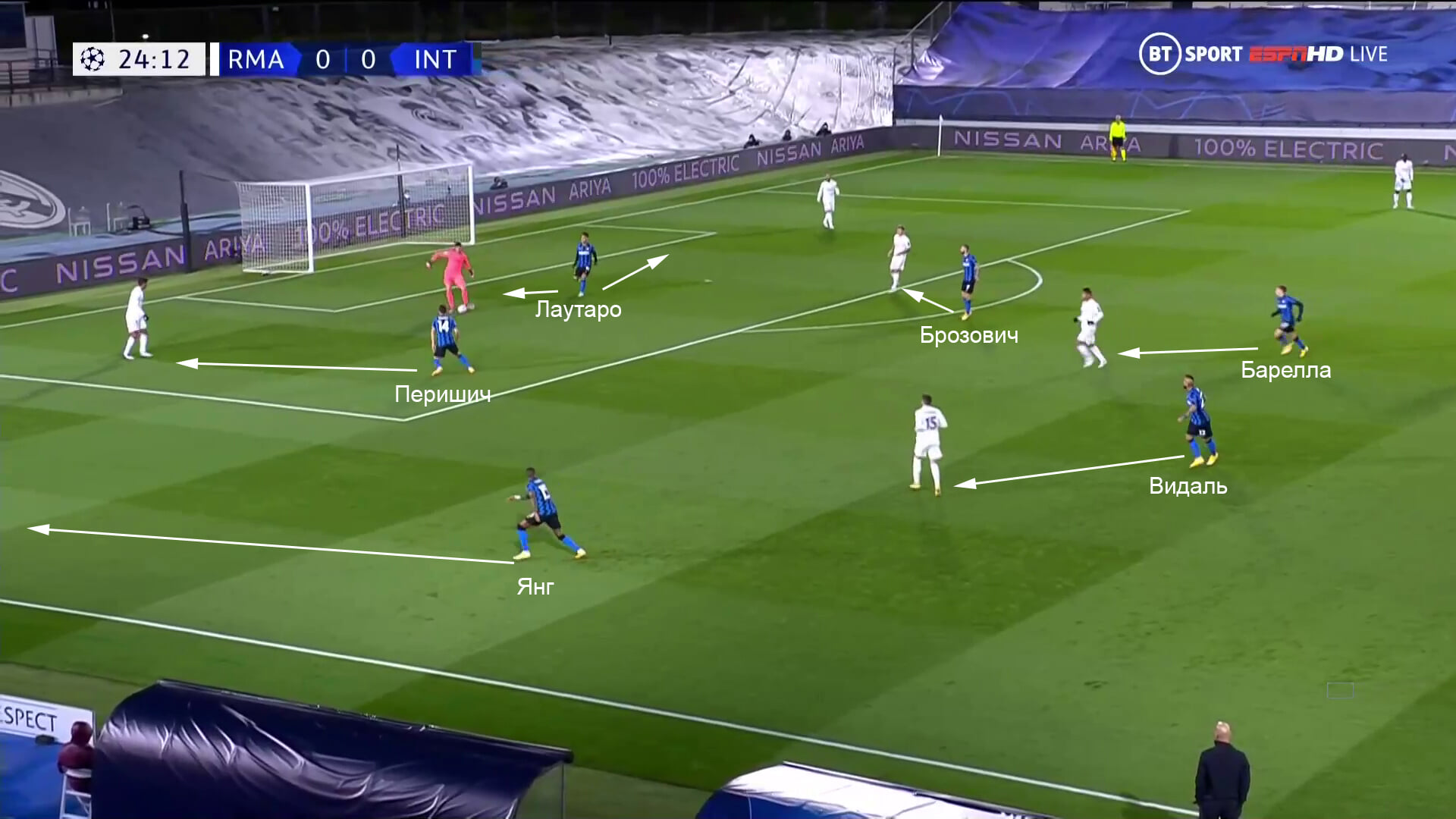 Именно так и поступили Конте с Зиданом. Команды просто садились в привычную оборонительную схему при позиционке (хотя таких эпизодов было не очень много). В случае «Реала» это схема 4-3-3 (4-1-4-1), а у «Интера» – 5-3-2.