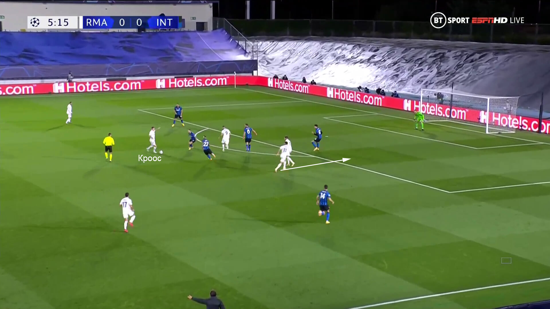 9. Важным игроком в таких переходных эпизодах был Тони Кроос. Его качественные решения часто позволяли «Реалу» обострять после высоких отборов. Например, здесь он думает явно быстрее остальных – отрежет от эпизода полузащитников «Интера» и развернет атаку на более свободный край:
