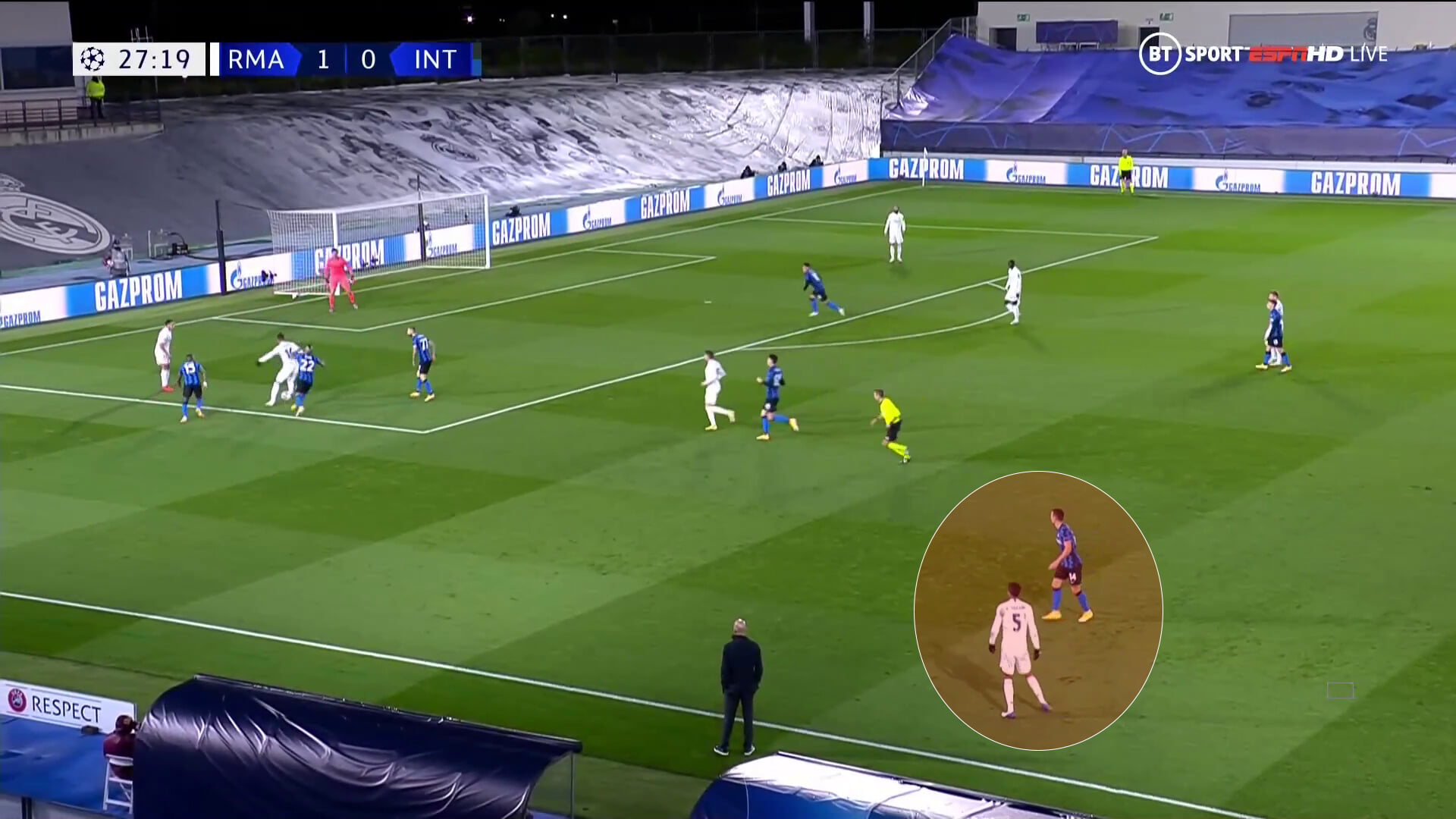 13. В одной зоне «Интер» все-таки не шел до конца при персональном прессинге. Эшли Янг иногда оставался сзади для надежности, а Лукас Васкес либо получал свободу, либо оказывался под запоздалым давлением Артуро Видаля (если чилиец чувствовал, что в конкретном эпизоде и Вальверде контролирует, и на Васкеса надавить может).