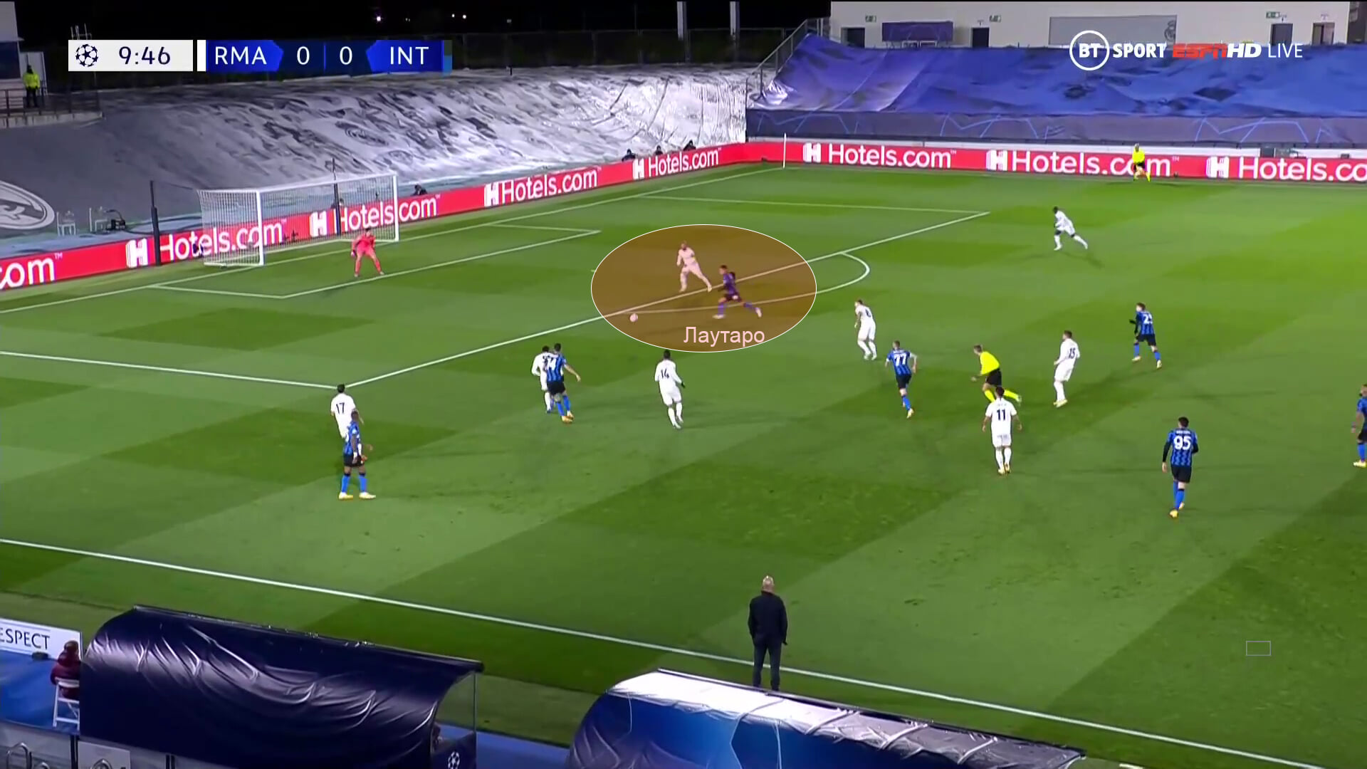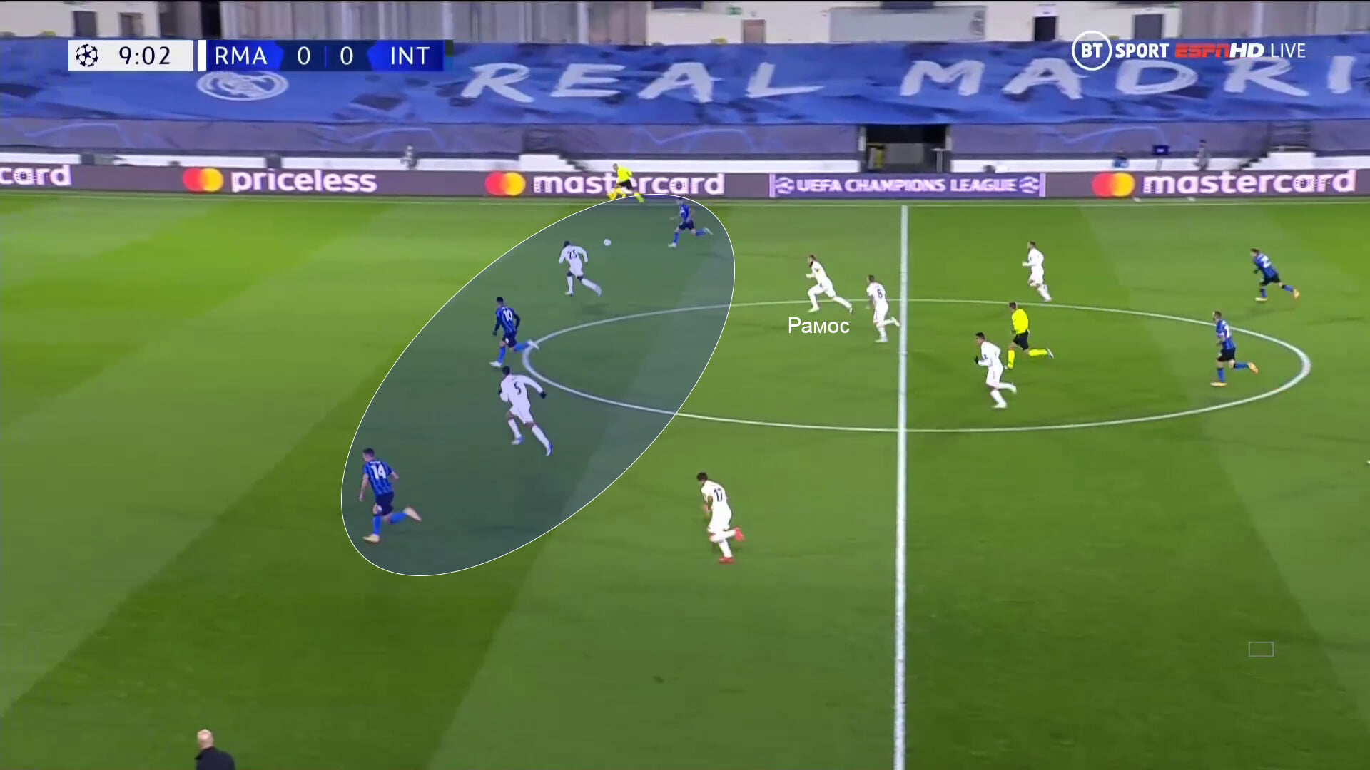 Против «Мадрида» персоналки выглядели так – Лаутаро перекрыл пас на Рамоса и давит на вратаря (стартовал с персональной игры против Серхио, но пошел дальше), а все остальные играют полностью персонально: