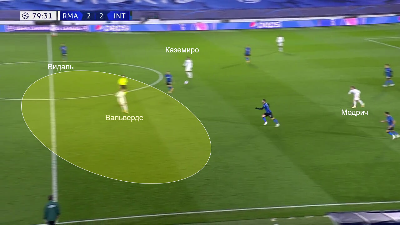 А это победный гол «Реала». При персональном прессинге соперника Феде пришел на чужой край поля – Видаль растерялся (или просто устал) и не пошел за ним. Вальверде получил возможность обработать мяч и связать атаку «Реала»: