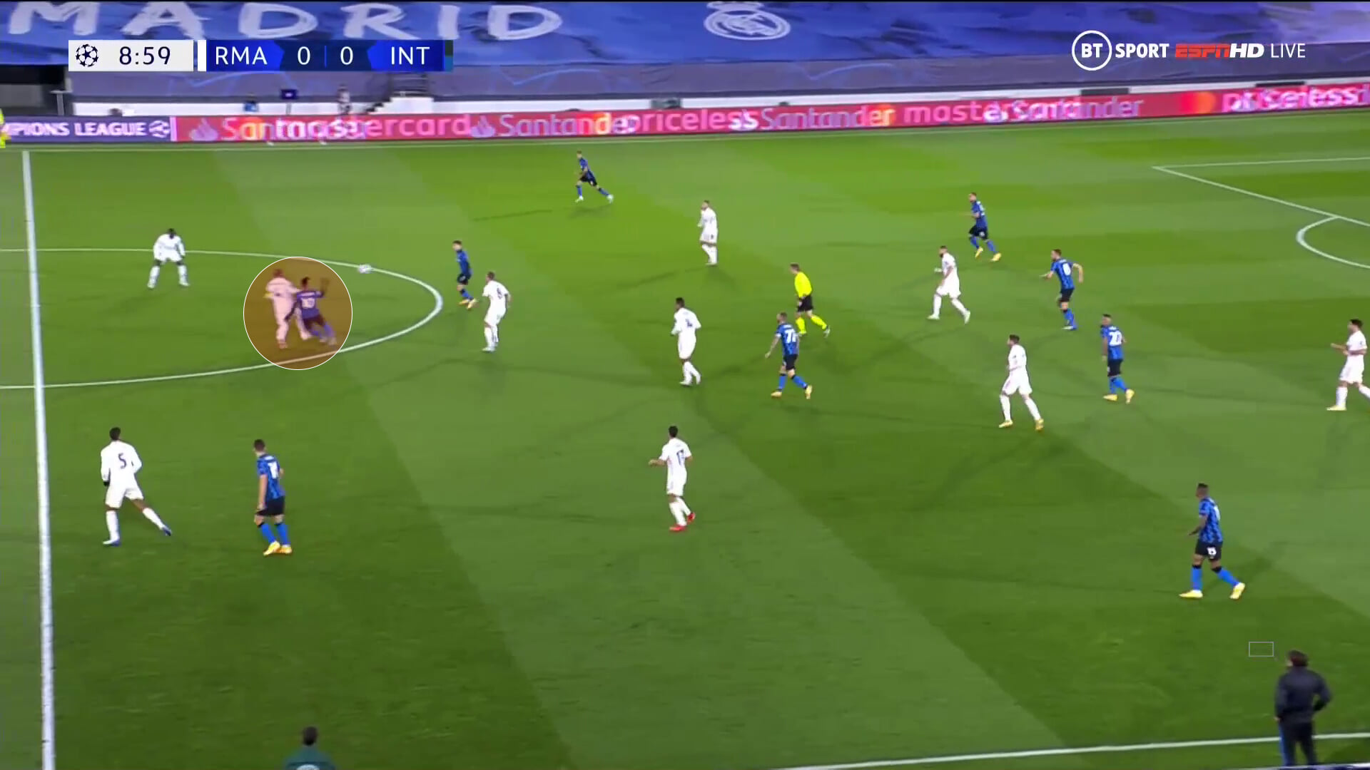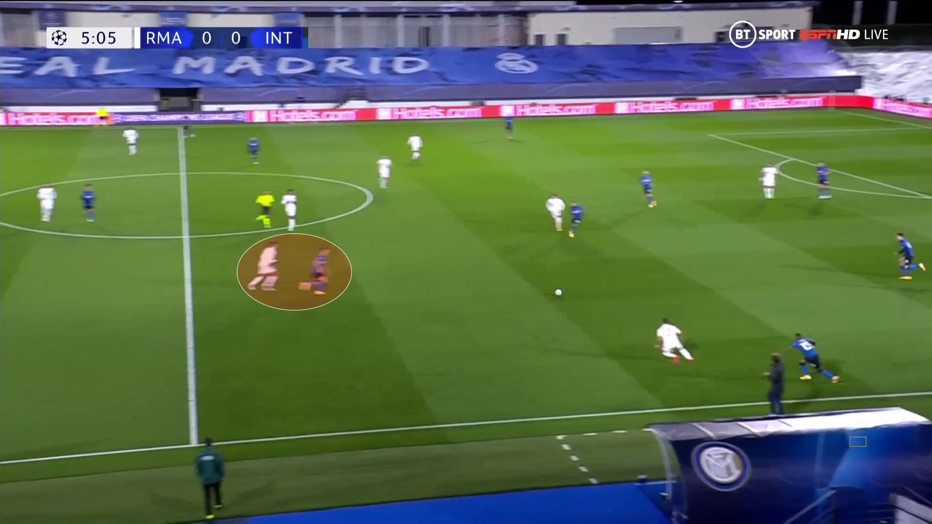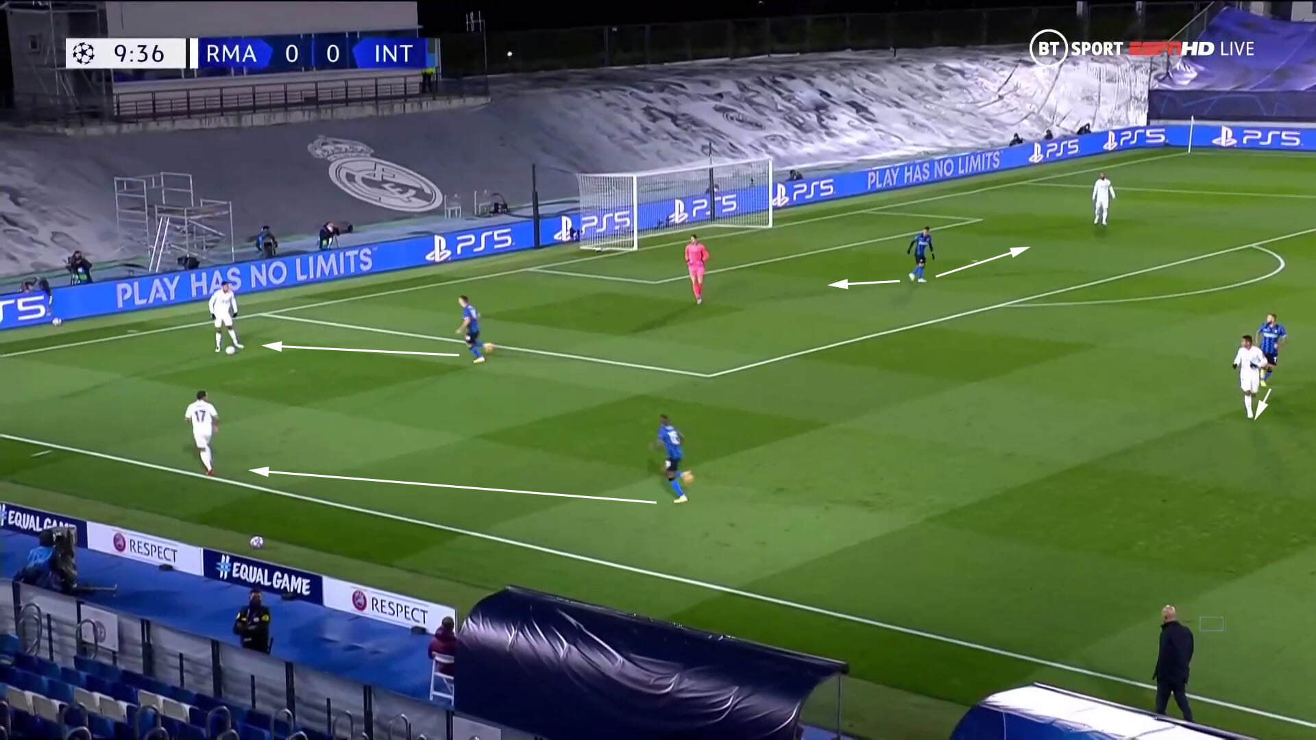 «Мадрид», как правило, разыгрывал после отборов. «Интеру» нужны были подобные стечения обстоятельств, чтобы извлекать моменты из прессинга. Не значит, что они прессинговали плохо – лишь то, что действия команд после отбора сильно отличались.