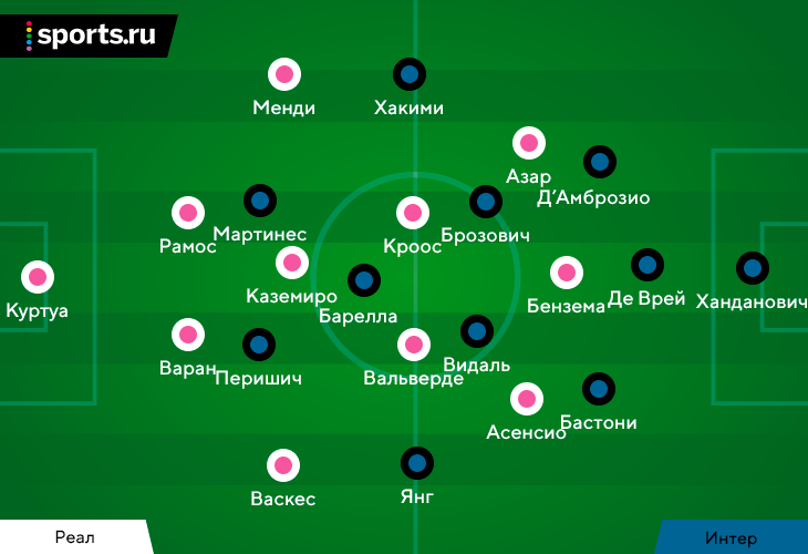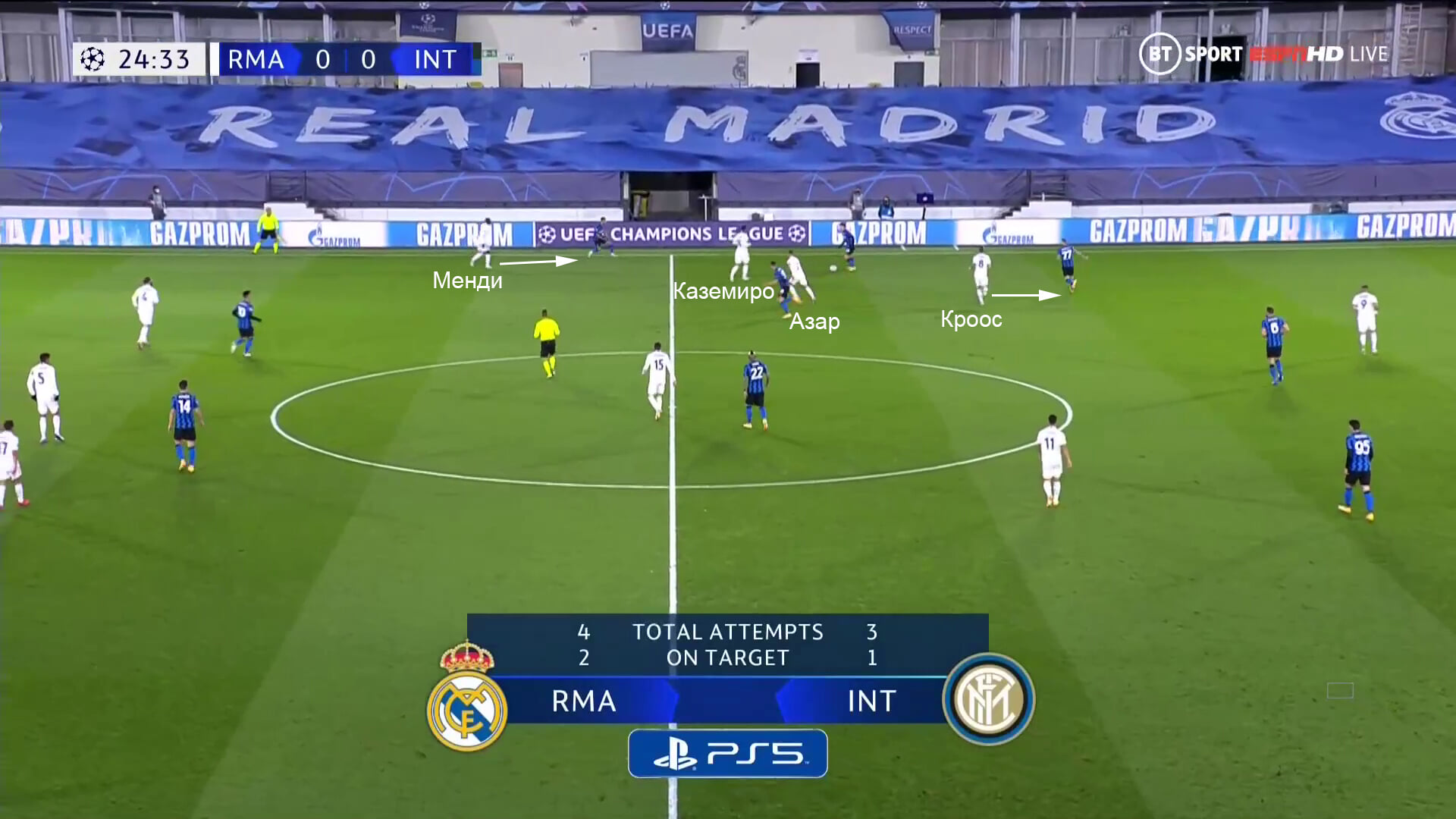 Первый гол тоже родился из персонального давления. Кроос весь эпизод очень четко давил на Брозовича, Каземиро – на Бареллу, Азар до упора играл с Д‘Амброзио, а Менди отобрал мяч у Хакими: