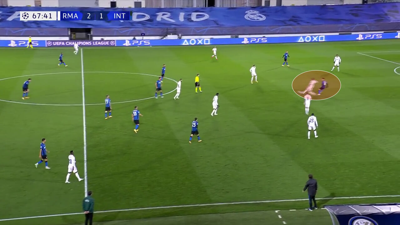 «Мадрид» действовал таким образом по всему полю. В этом эпизоде обратите внимание на позиции Асенсио и Азара. Оба вингеры, но в очень разных зонах – позиция каждого из них определяется позицией прямого оппонента (Д’Амброзио и Бастони):