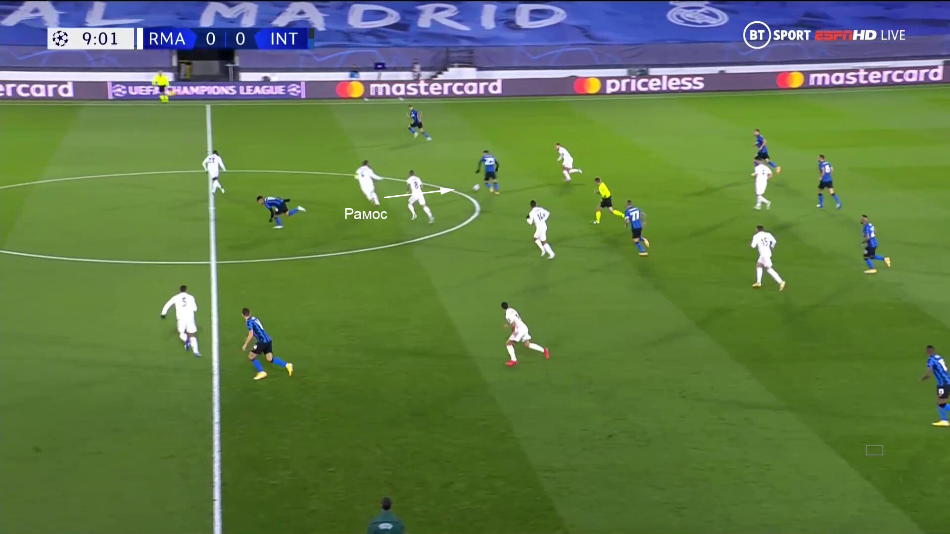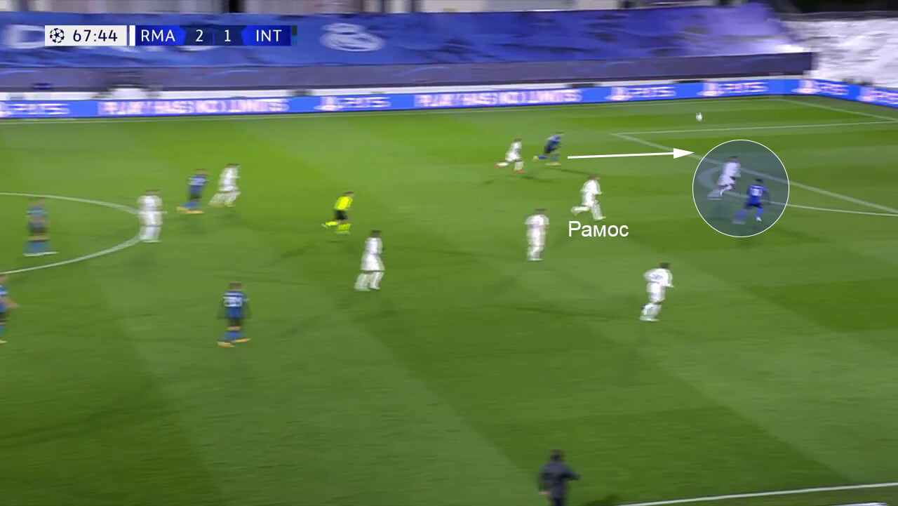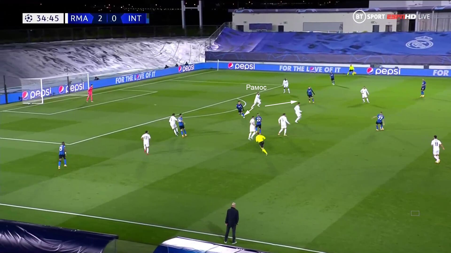 12. В голах «Интера» Рамос тоже был в антигероях (не единственным, но в совокупности с проблемами при прессинге это сильно настораживает). Они не были эпизодами прессинга, но против Серхио играло то же качество – необдуманная агрессивность при выдвижениях.