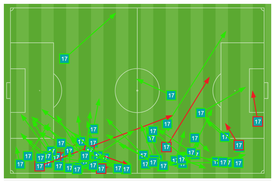 Это привело к тому, что Васкес получал мяч чаще любого футболиста «Мадрида». Из-за чуть большей свободы, чем у остальных, он сделал 72 передачи. Но характер пасов скорее подтвердил, что Конте был прав, предоставляя Лукасу такие возможности – в стадии розыгрыша почти все его передачи шли назад, что лишь подставляло «Реал» под новую волну прессинга:
