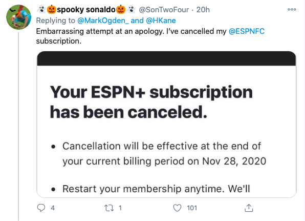 Некоторые болельщики не приняли извинение. Под реплаем об отмене подписки на ESPN более 100 лайков.