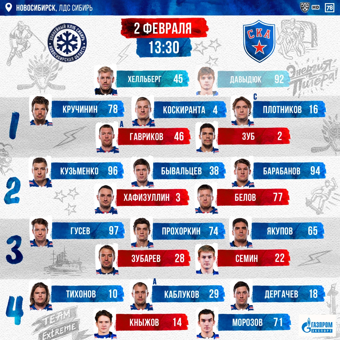 Хоккейный клуб СКА объявил состав на матч с «Сибирью» в рамках регулярного чемпионата Континентальной хоккейной лиги (КХЛ), сообщается на официальной странице петербургского клуба «Вконтакте».