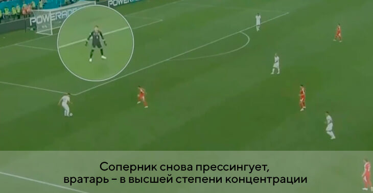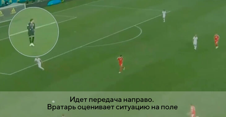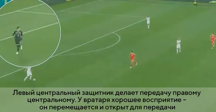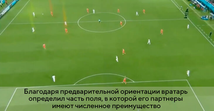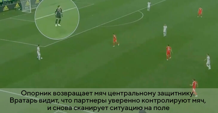 Вратарь должен предварительно просканировать, где находится мяч, а где – партнеры и соперники. Только так он сможет оценить, кто из соперников готов оказать давление на него и его партнеров и в какую зону выгоднее отдать передачу.